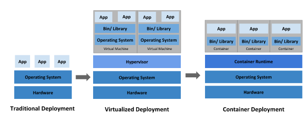 가상화된 배포 시대 (VM의 도입): 그 해결책으로 가상화가 도입되었다. 이는 단일 물리 서버의 CPU에서 여러 가상 시스템 (VM)을 실행할 수 있게 한다. 가상화를 사용하면 VM간에 애플리케이션을 격리하고 애플리케이션의 정보를 다른 애플리케이션에서 자유롭게 액세스 할 수 없으므로, 일정 수준의 보안성을 제공할 수 있다.